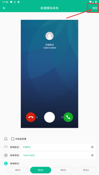 3、設(shè)置完成后,點(diǎn)擊右上角保存按鈕,保存新建的模擬來(lái)電設(shè)置。