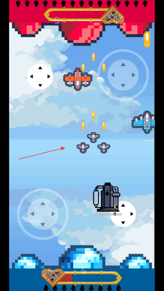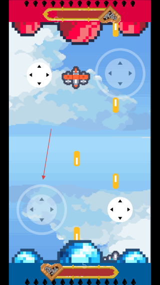 1、進(jìn)入游戲,通過屏幕上的虛擬方向鍵操控己方飛機(jī)移動(dòng),躲避上方紅色區(qū)域發(fā)射的子彈。