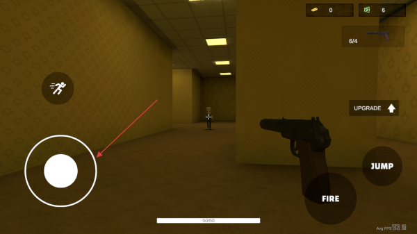 1、進(jìn)入游戲,通過屏幕左下方虛擬搖桿控制角色移動(dòng),在黃色調(diào)的走廊場(chǎng)景中探索。
