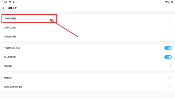 3、在選項(xiàng)設(shè)置頁面,點(diǎn)擊下載保存路徑選項(xiàng),可設(shè)置音樂等文件的下載保存位置。