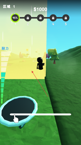 2、在行進(jìn)過(guò)程中,留意左側(cè)耐力條,利用場(chǎng)景中的道具,如蹦床,點(diǎn)擊屏幕控制火柴人借助蹦床起跳。