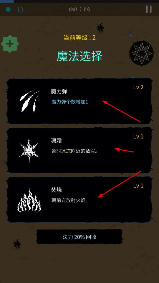 2、等級提升后,在魔法選擇界面,可選擇魔力彈,凜霜,焚燒等魔法,借助不同魔法效果增強戰(zhàn)力。