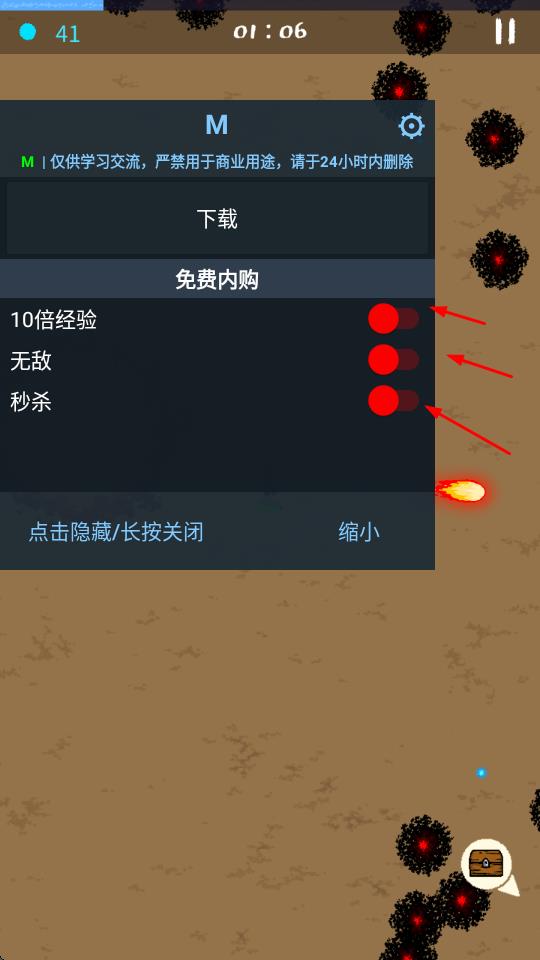 3、可使用功能菜單,開啟10倍經驗,無敵,秒殺等免費內購效果,助力更輕松地探索與戰(zhàn)斗。