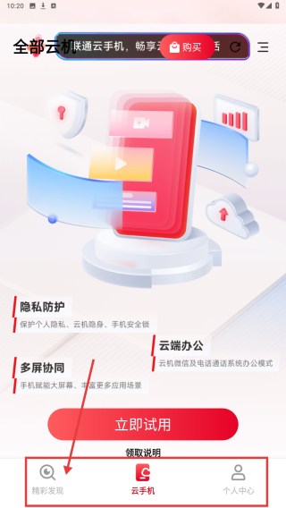 1、打開聯(lián)通云手機(jī)類應(yīng)用,點(diǎn)擊底部精彩發(fā)現(xiàn)選項,進(jìn)入精彩發(fā)現(xiàn)頁面。
