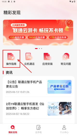 2、在精彩發(fā)現(xiàn)頁面,點(diǎn)擊操作指南選項,查看聯(lián)通云手機(jī)使用說明。