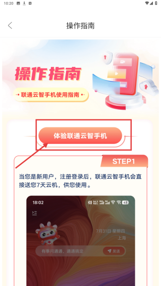 3、在操作指南頁面,點(diǎn)擊體驗聯(lián)通云智手機(jī)按鈕,開始體驗云手機(jī)服務(wù)。