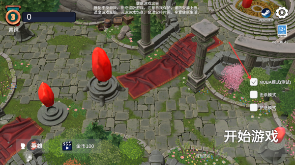 1、進(jìn)入界面查看左側(cè),確認(rèn)游戲模式,如MOBA模式,點(diǎn)擊開(kāi)始游戲準(zhǔn)備選擇英雄。