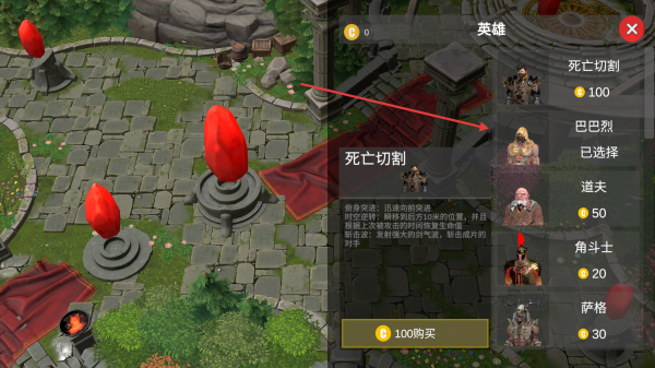 2、點(diǎn)擊英雄按鈕,花費(fèi)金幣購(gòu)買(mǎi)或選擇已有的英雄,比如巴巴烈,查看英雄技能說(shuō)明以了解其戰(zhàn)斗特性。