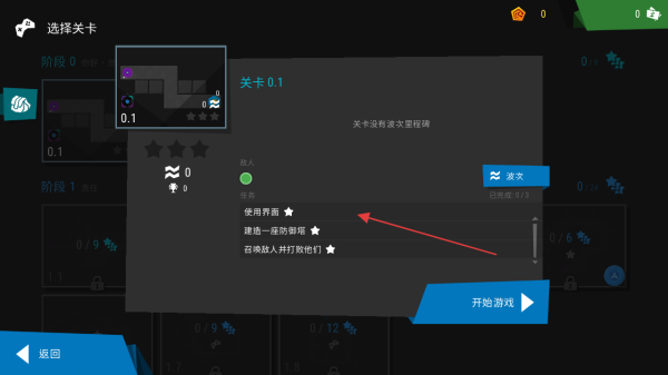 1、在選擇關(guān)卡界面,確認(rèn)關(guān)卡0.1的任務(wù)目標(biāo),如使用界面建造一座防御塔,召喚敵人并打敗他們,點(diǎn)擊開始游戲。