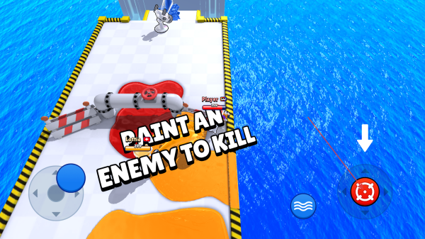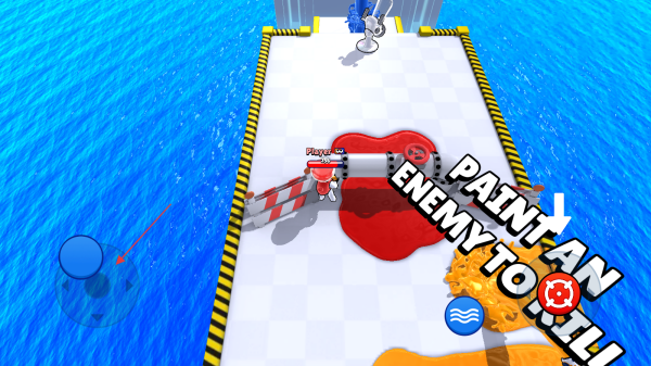 1、游戲中通過左側(cè)藍色搖桿控制角色移動 ,遇到敵人時點擊右側(cè)紅色圓形按鈕,噴射顏料擊殺敵人。