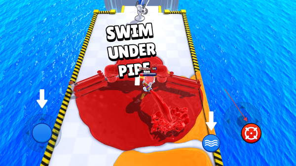 3、當遇到管道障礙時,點擊左側(cè)搖桿移動,再點擊右側(cè)波浪按鈕,讓角色從管道下方的顏料區(qū)域游過去 。