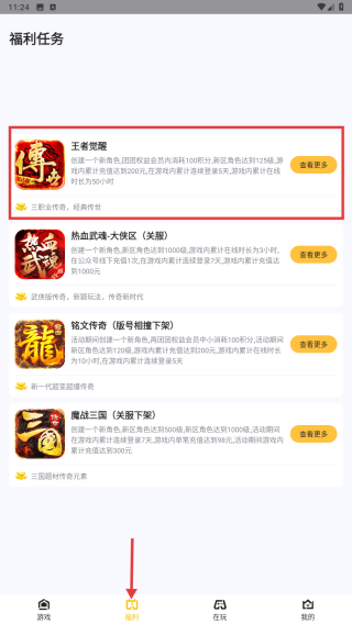 2、點(diǎn)擊底部福利選項(xiàng),進(jìn)入福利任務(wù)頁(yè)面,查看王者覺(jué)醒等多款游戲的福利活動(dòng),如金幣獎(jiǎng)勵(lì)、時(shí)長(zhǎng)獎(jiǎng)勵(lì)等。