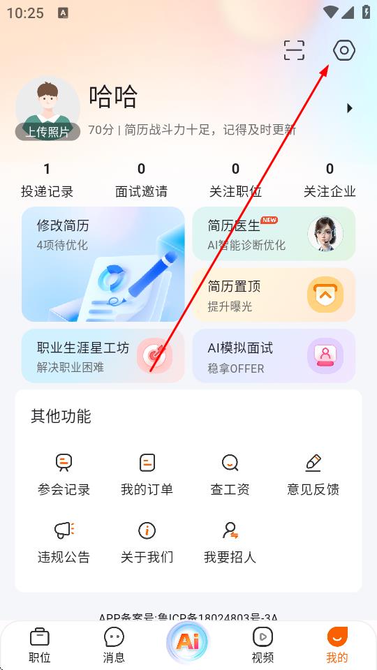 2、在我的頁(yè)面,點(diǎn)擊右上角的設(shè)置圖標(biāo)。