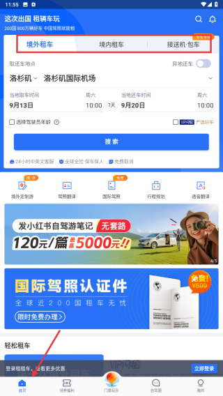 1、打開(kāi)租車APP首頁(yè),可選擇境外租車、境內(nèi)租車、接送機(jī)包車等服務(wù),設(shè)置取還車地點(diǎn)、時(shí)間等信息后點(diǎn)擊搜索,還能查看國(guó)際駕照認(rèn)證等相關(guān)服務(wù)。
