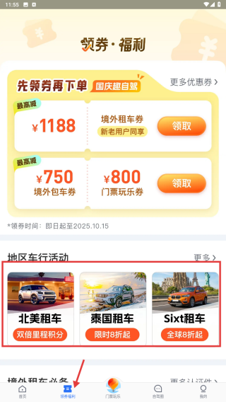 2、點(diǎn)擊領(lǐng)券,進(jìn)入領(lǐng)券·福利頁(yè)面,可領(lǐng)取境外租車券、境外包車券、門(mén)票玩樂(lè)券等,還能查看北美租車、泰國(guó)租車等地區(qū)車行活動(dòng)。