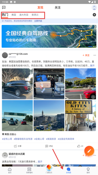 3、點(diǎn)擊發(fā)現(xiàn),進(jìn)入發(fā)現(xiàn)頁(yè)面,可瀏覽美國(guó)、澳大利亞、新西蘭等熱門(mén)自駕目的地相關(guān)內(nèi)容,查看全國(guó)經(jīng)典自駕路線等自駕指南及用戶分享的自駕經(jīng)歷。