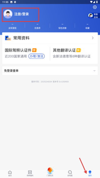 4、點(diǎn)擊我的,進(jìn)入個(gè)人頁(yè)面,可進(jìn)行注冊(cè)/登錄操作,管理常用資料,如國(guó)際駕照認(rèn)證件、其他翻譯認(rèn)證等,還能查看優(yōu)惠券、信任金等信息。