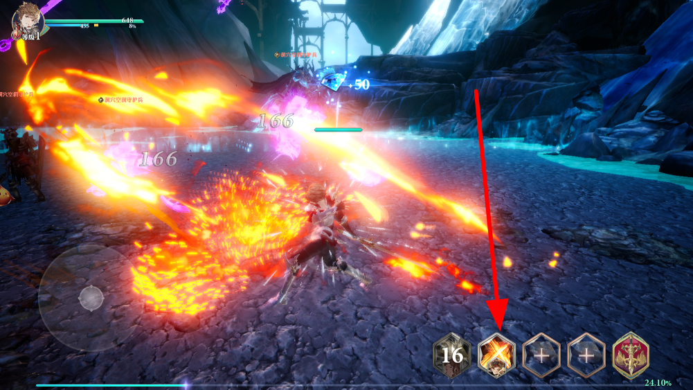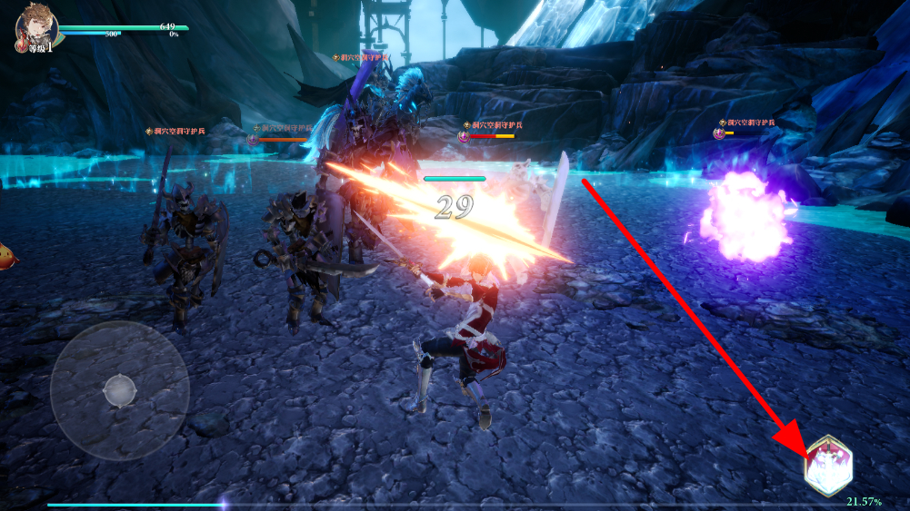 2、屏幕右側(cè)有攻擊釋放按鈕,點擊該按鈕,角色可釋放普通攻擊,對怪物造成傷害,可以連續(xù)點擊進行連擊,根據(jù)戰(zhàn)斗情況選擇使用。
