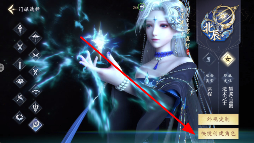 1、新手可選擇不同門派,像北辰這類法術(shù)、兼具輔助與回復(fù)能力的門派,選好門派后,點(diǎn)擊創(chuàng)建角色,開(kāi)啟武俠冒險(xiǎn)之旅。