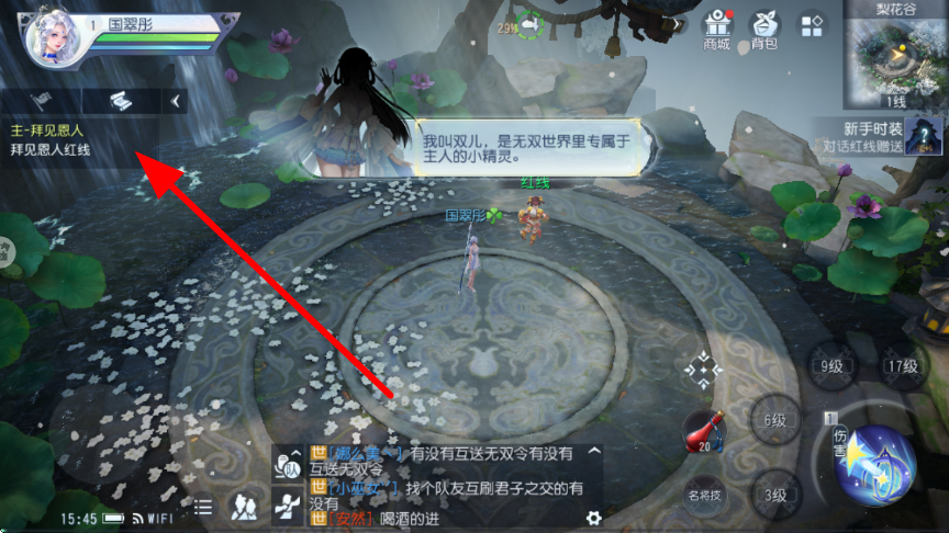 2、進(jìn)入游戲后,會(huì)有主線任務(wù)指引,拜見(jiàn)恩人紅線等任務(wù),推進(jìn)主線任務(wù)進(jìn)程,在完成任務(wù)過(guò)程中了解武俠世界的故事,提升角色實(shí)力。