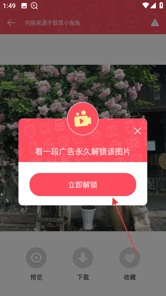 4、在彈窗中,點(diǎn)擊立即解鎖,觀看廣告后即可永久解鎖并下載該圖片。