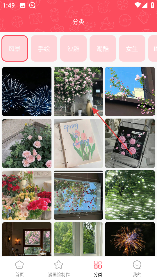 2、在分類頁面,選擇喜歡的圖片如風(fēng)景類中的粉色花簇圖,進(jìn)入圖片詳情頁。