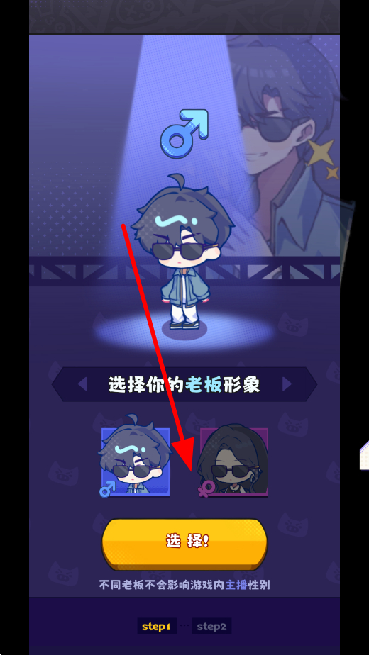 1、玩家進入游戲,創(chuàng)建在老板形象選擇界面,挑選心儀的老板形象,確定后點擊選擇,開啟在江南第一主播公司的經(jīng)營之旅。
