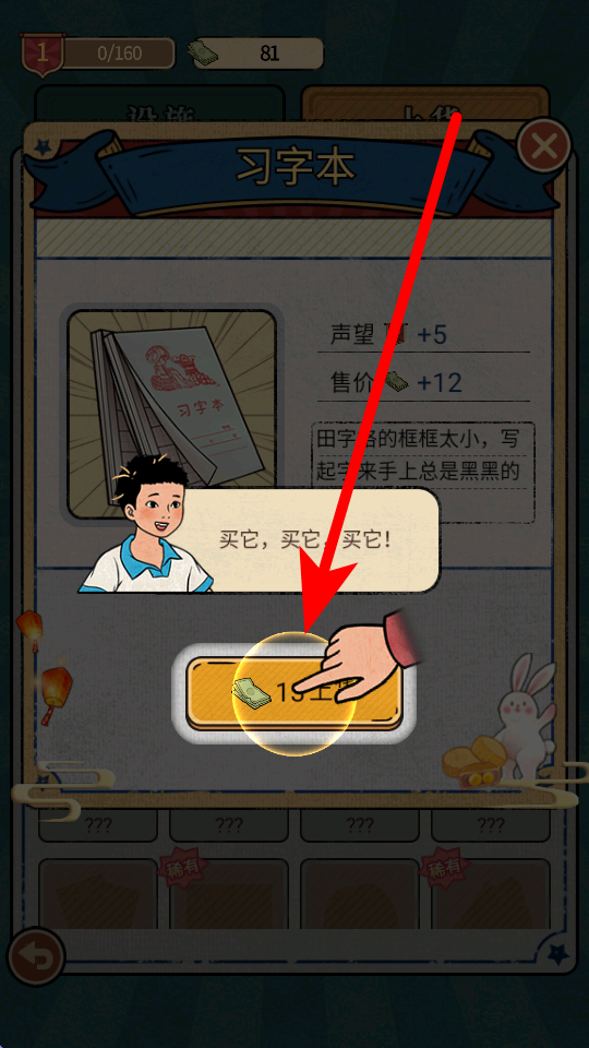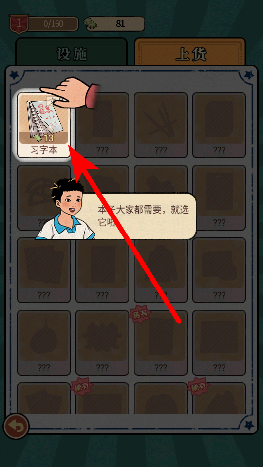 2、選好商品,比如習(xí)字本,會彈出商品詳情界面,上面標(biāo)注著商品能帶來的聲望、售價等信息,確認(rèn)無誤后,點(diǎn)擊標(biāo)有金額的上貨按鈕,完成商品上架操作。