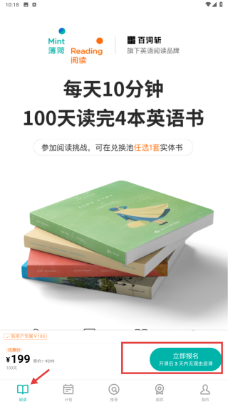 3、閱讀完成后,若想?yún)⑴c閱讀挑戰(zhàn),可返回首頁點(diǎn)擊立即報(bào)名按鈕,參與每天10分鐘,100天讀完4本英語書的閱讀挑戰(zhàn)活動(dòng)。