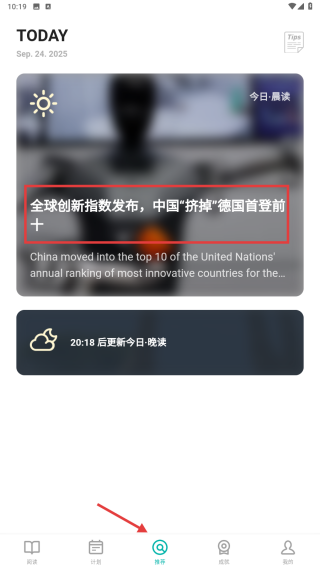 2、在閱讀頁面,點(diǎn)擊今日晨讀的文章條目如全球創(chuàng)新指數(shù)發(fā)布,中國‘?dāng)D掉德國首登前+,進(jìn)入文章詳情頁進(jìn)行閱讀。