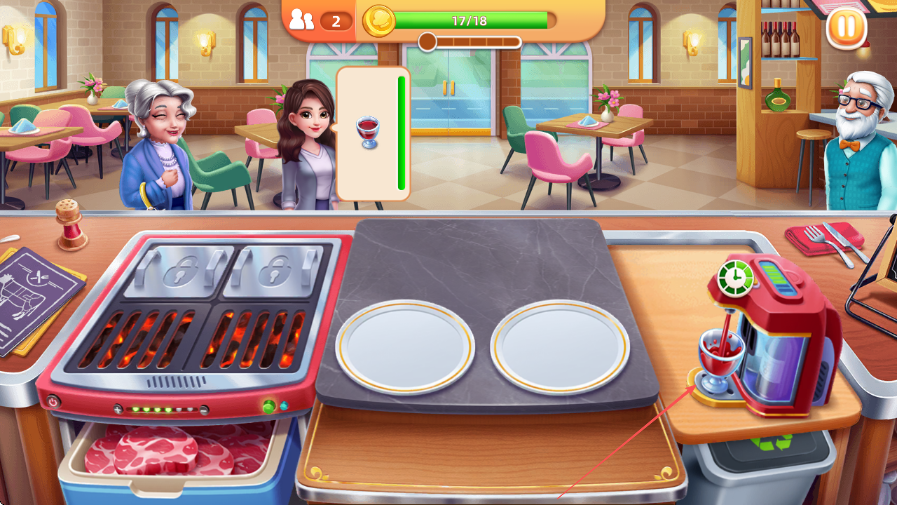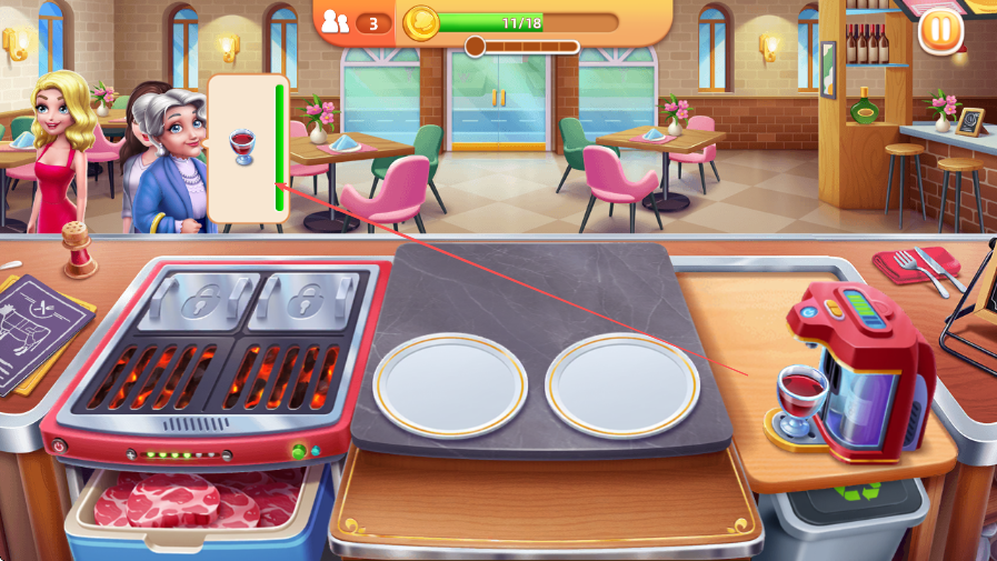 2、點(diǎn)擊右側(cè)機(jī)器制作紅酒并上菜,繼續(xù)滿足其他顧客需求。