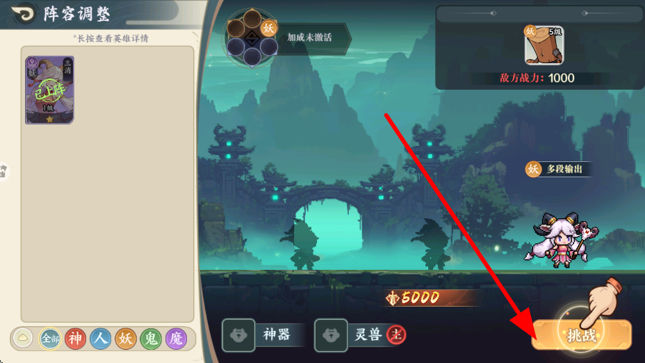 1、陣容調(diào)整界面,可從神、人、妖、鬼、魔等類別中挑選英雄,搭配出契合挑戰(zhàn)需求的陣容,之后點(diǎn)擊挑戰(zhàn),向敵人發(fā)起進(jìn)攻。
