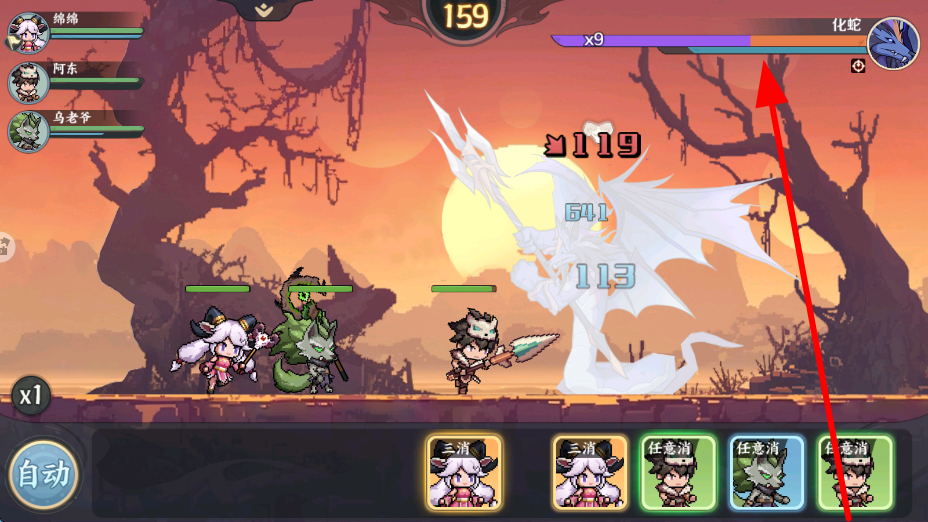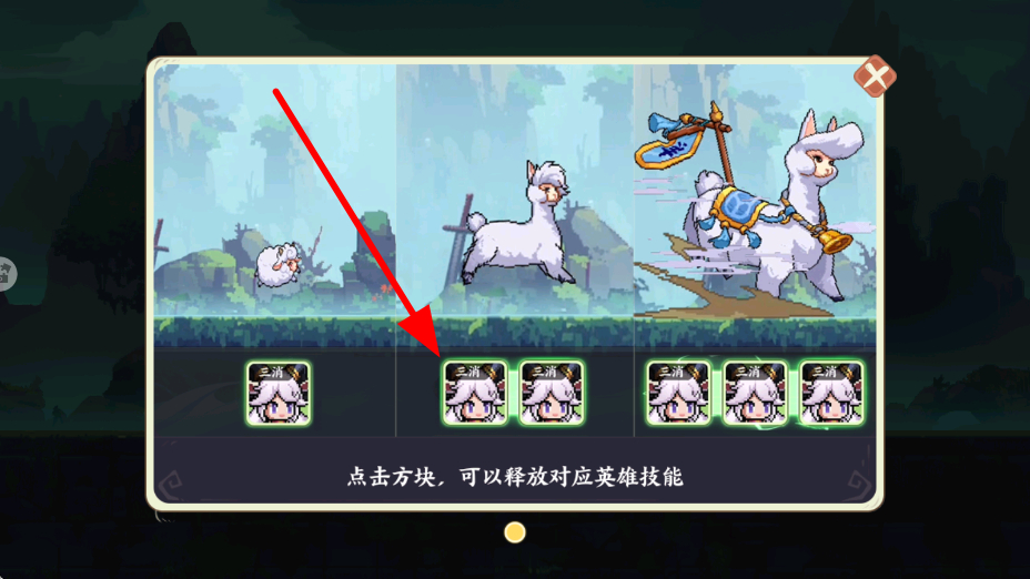 2、會有指引提示,根據(jù)提示點(diǎn)擊對應(yīng)方塊,可釋放對應(yīng)英雄的技能,借助這些技能,對首領(lǐng)怪物發(fā)起攻擊,逐步削減首領(lǐng)怪物的血量。