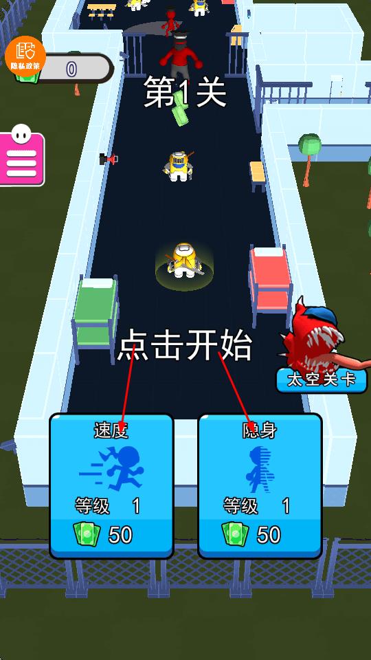 2、進入關(guān)卡后,點擊開始,可選擇速度或隱身等技能,助力游戲進程。