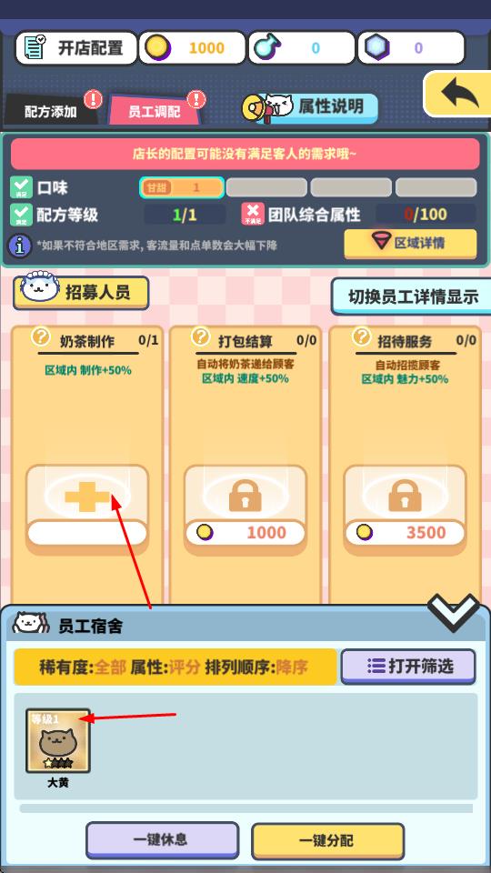 3、在開店配置界面,進行配方添加、員工調配等操作,根據區(qū)域需求合理配置,滿足客人需求,提升客流量和點單數。