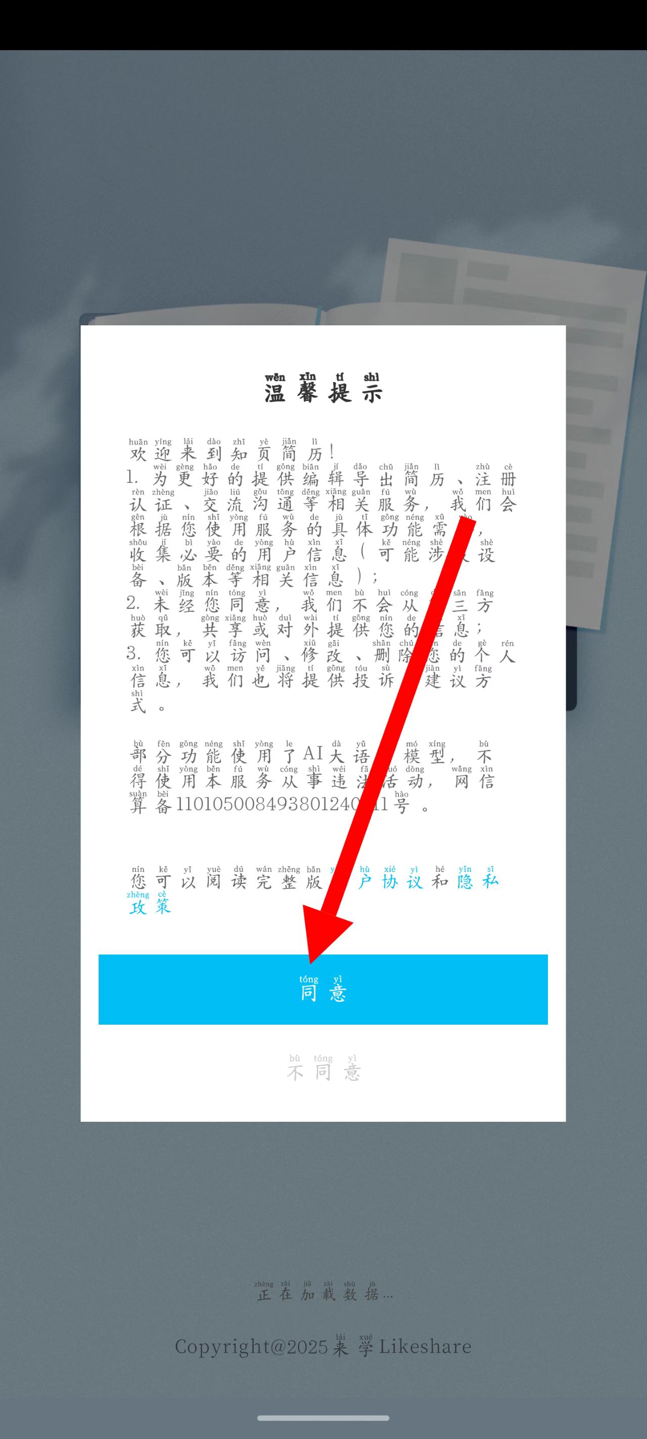 1、打開知頁簡歷APP,在溫馨提示頁面,點擊同意。