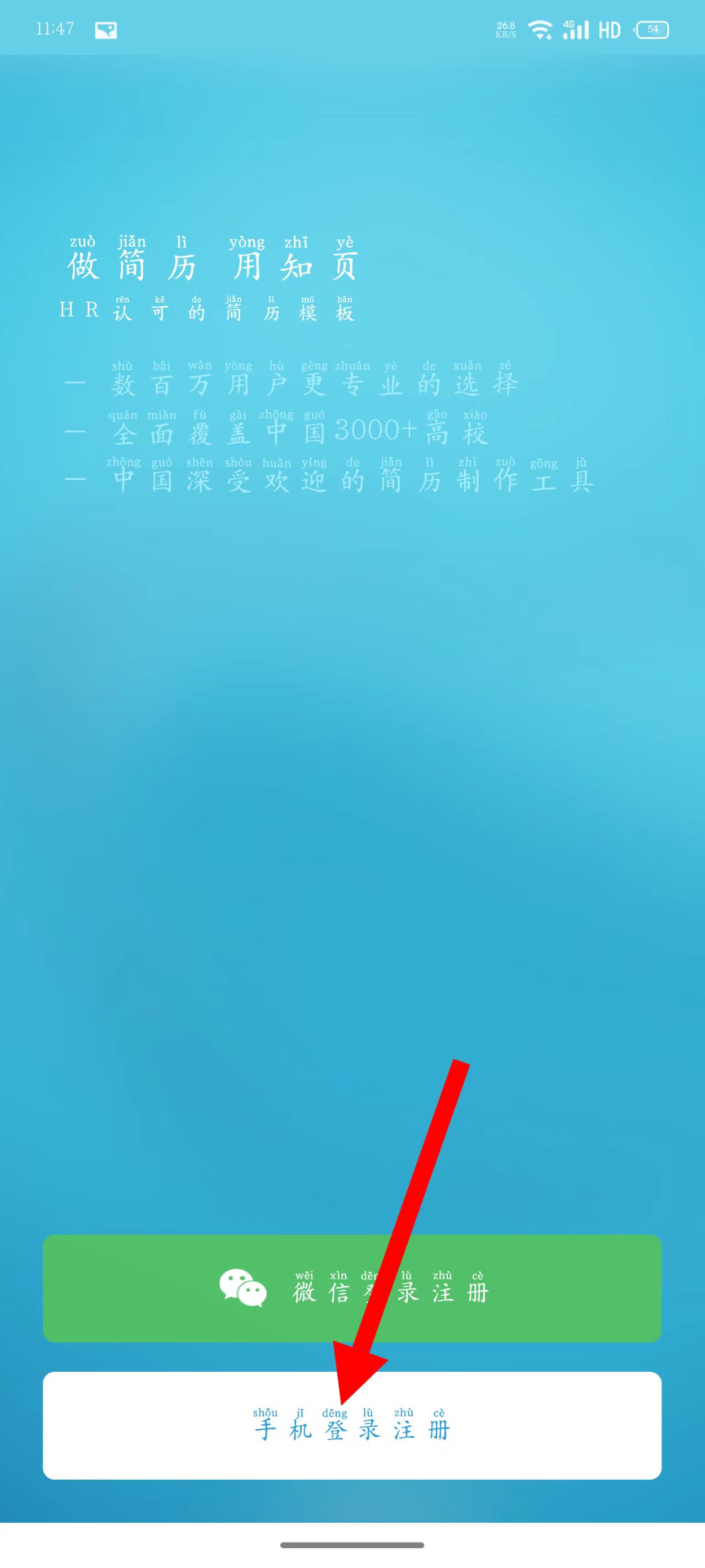 2、進入登錄注冊頁面后,點擊手機登錄注冊。