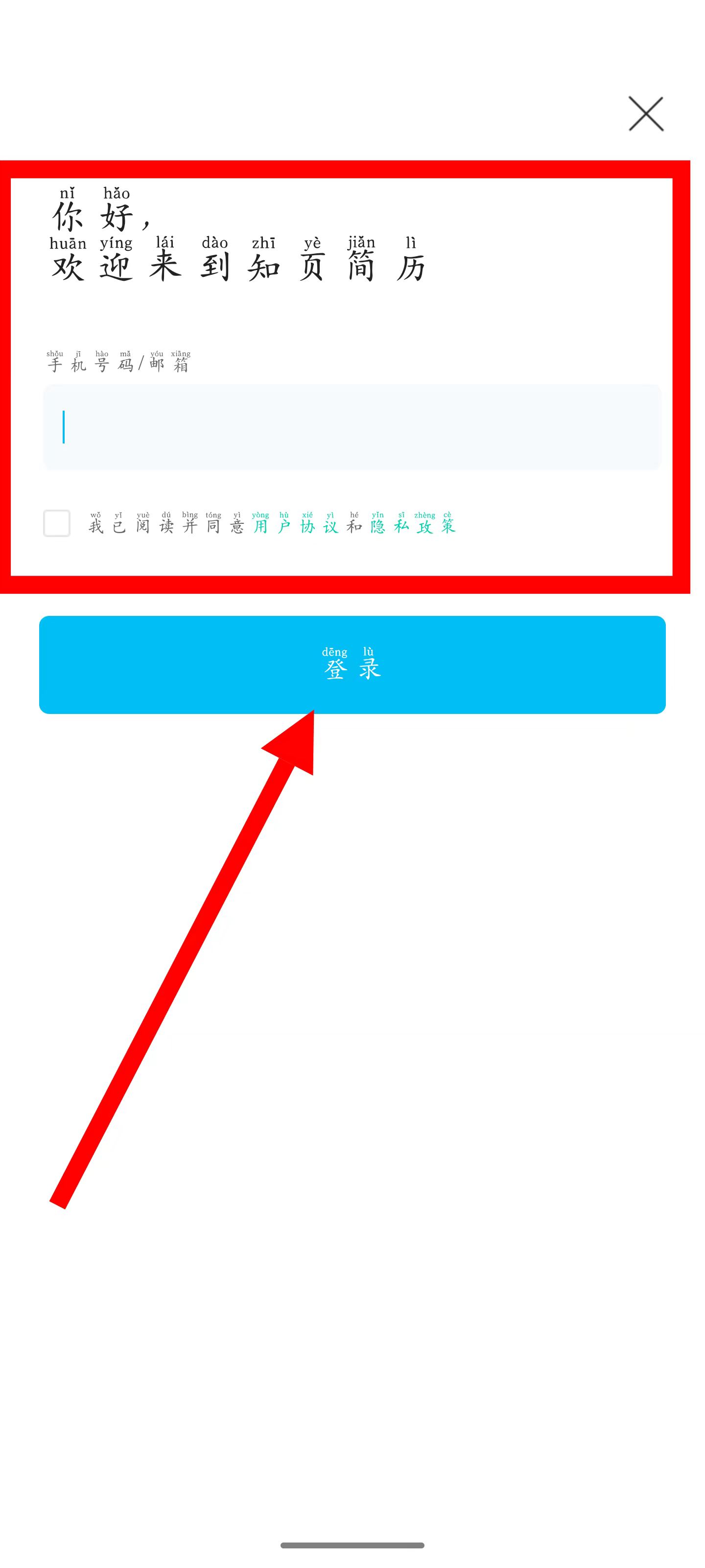 3、輸入手機號碼或郵箱,勾選后,點擊登錄。