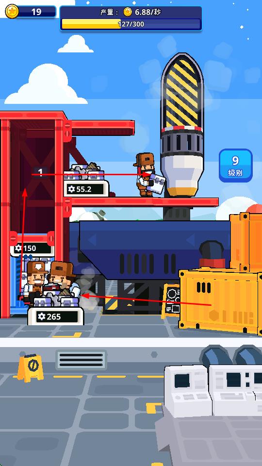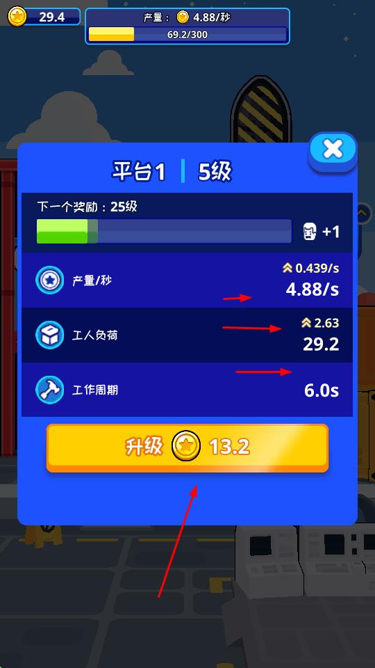 1、可對平臺進行升級,消耗金幣提升平臺等級,增加產(chǎn)量/秒、調(diào)整工人負荷和工作周期等屬性。