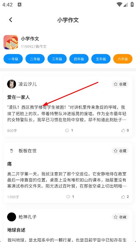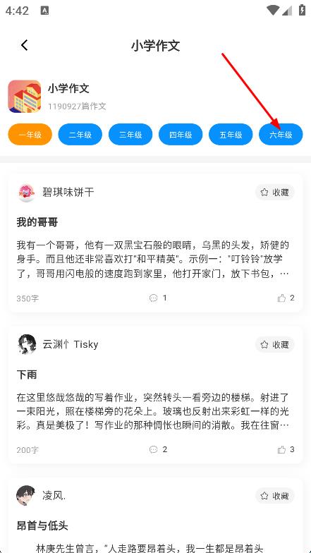 2、在小學(xué)作文頁(yè)面,點(diǎn)擊六年級(jí),查看六年級(jí)作文列表。