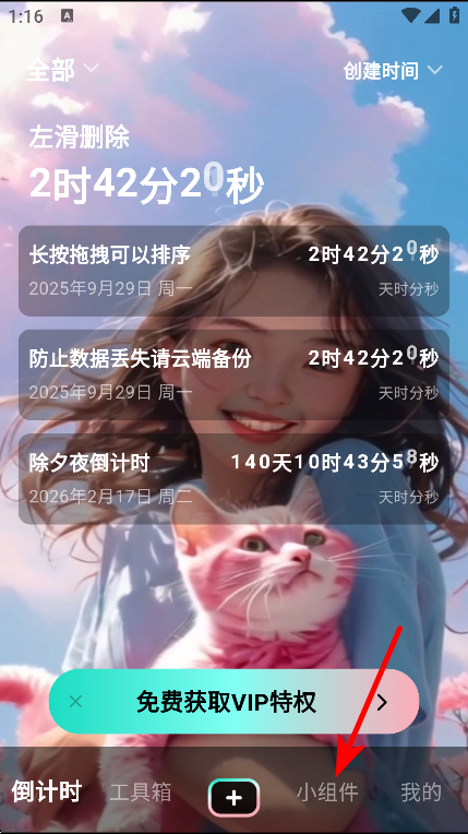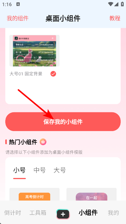 2、在倒計時光主頁面,點擊小組件,進入小組件選擇頁面。