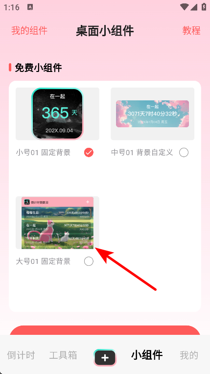 3、在小組件選擇頁面,選擇一款小組件,如大號01固定背景。