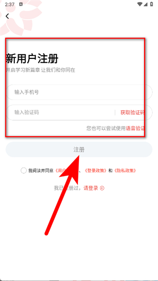4、輸入手機號,獲取并輸入驗證碼,勾選后,點擊注冊,完成注冊。