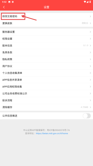 3、在設(shè)置界面,點擊修改交易密碼選項,進(jìn)入賬戶激活頁面。