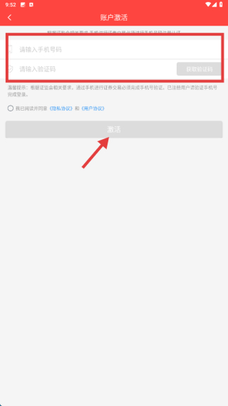 4、在賬戶激活頁面,輸入手機(jī)號碼和驗證碼,點擊激活按鈕,后續(xù)按提示完成交易密碼修改操作。