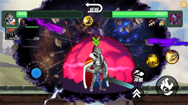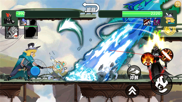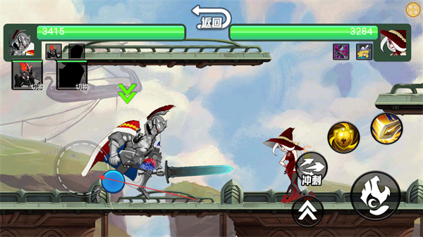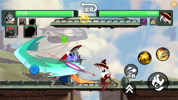 2、點(diǎn)擊虛擬方向鍵靠近對手,再點(diǎn)擊右側(cè)技能按鈕,像沖刺等技能,對對手發(fā)起攻擊。