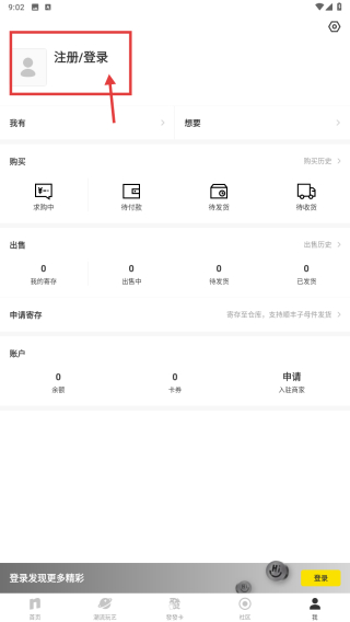 2、在個人中心,點擊注冊/登錄選項,進入登錄注冊頁面。