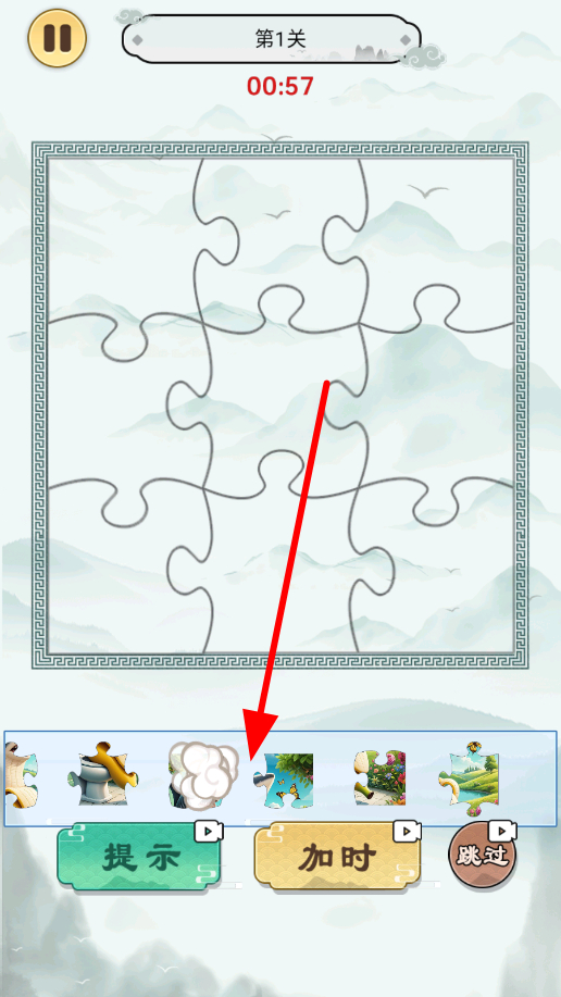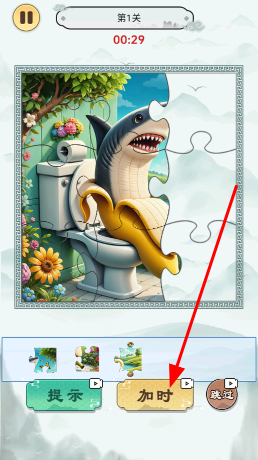 3、使用提示功能獲取拼圖線索,也能使用加時(shí)功能增加拼圖時(shí)間,為順利完成拼圖提供幫助。