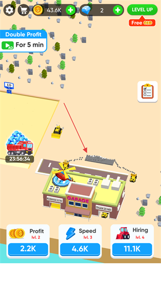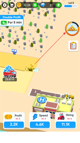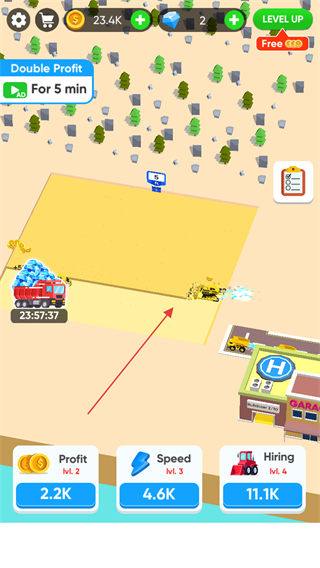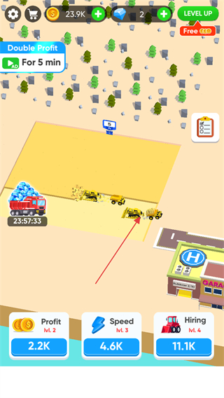 2、點擊下方Hiring按鈕,花費金幣雇傭更多推土機,提升挖掘效率。