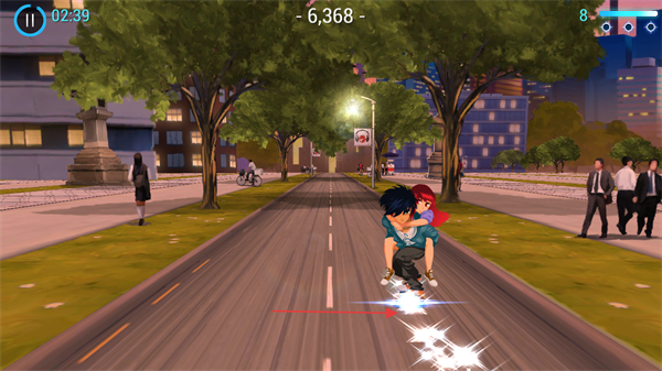 1、游戲開始,操控角色在道路上滑行,留意屏幕上方的倒計(jì)時(shí)如02:39和分?jǐn)?shù)如-6,368。